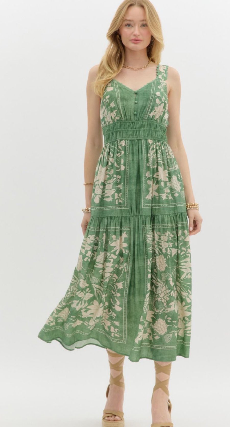 Scarf pattern trim accented adjustable shoulder strap pullover midi dress featuring ruching accented elasticated waist and button front closure. Lined. Woven. Non-sheer. Lightweight.Fabric Content 80%RAYON 20%NYLON