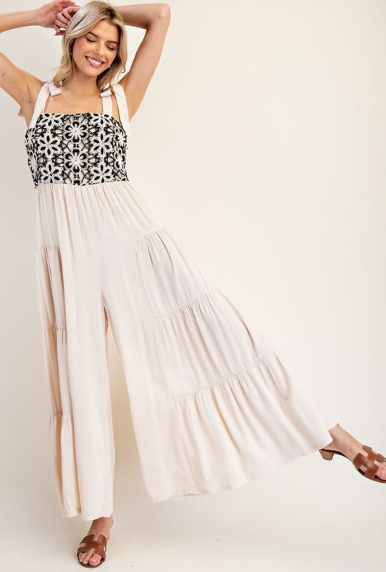 Sleeveless tiered wide-leg jumpsuit featuring floral lace detailing on the bodice, adjustable tie straps, a smocked back for a comfortable fit, two side pockets, and a flowy, feminine silhouette.