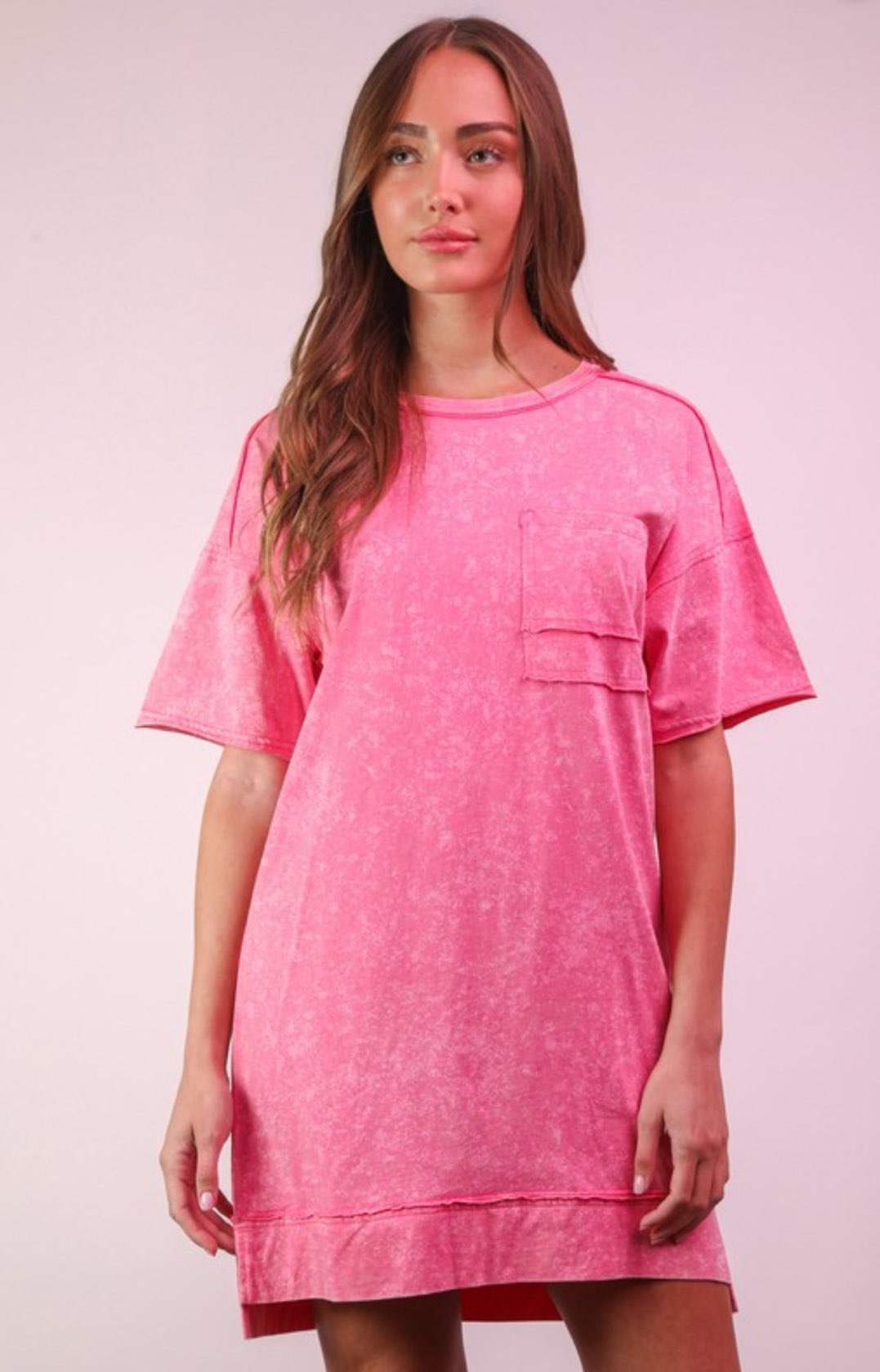 Mineral Washed Knit Oversized Shift Mini Dress- Patch Pocket- Short Sleeve- Drop Shoulder- Raw Edge Detail- Side Slit- Hi-lo Hem